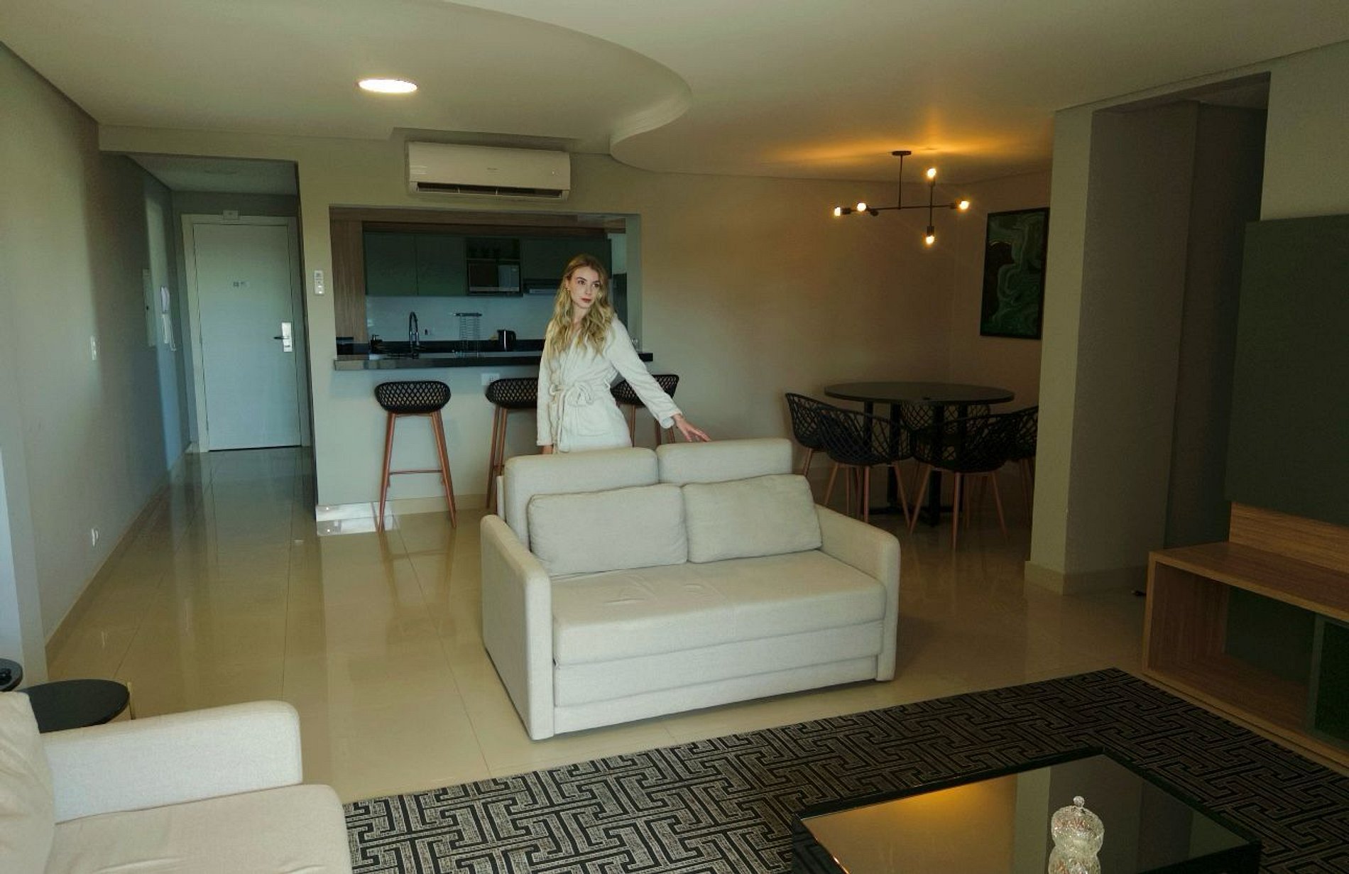 Apartamentos completos. Área de lazer compartilhada disponível durante o dia, com piscina, jacuzzi, sauna, academia, brinquedoteca, salão de beleza, sala de jogos. Recepção 24h sempre disponível para auxiliar no que precisar. Além disso, mercado de uso exclusivo de hóspedes 24h.