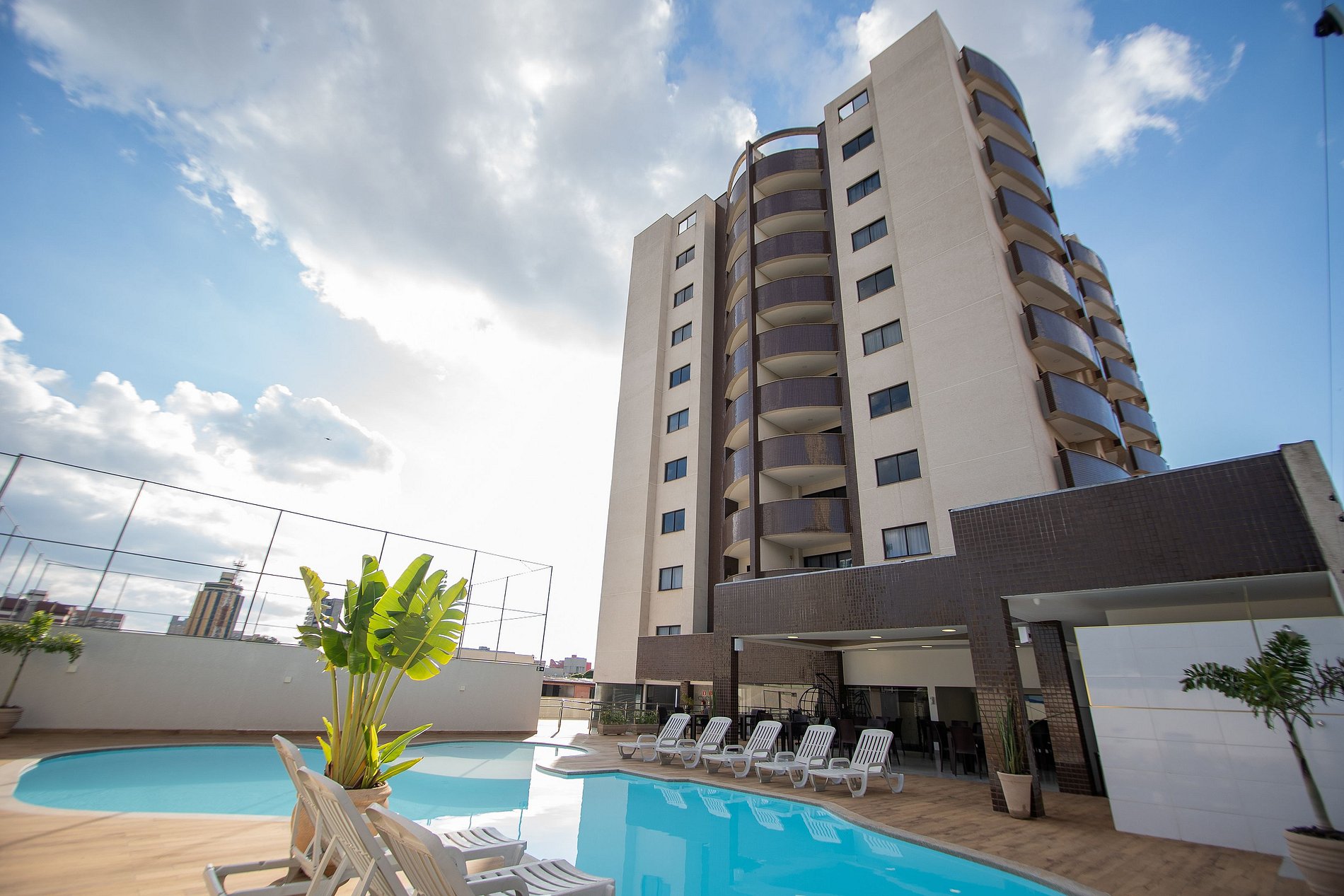Apartamentos modernos de 120 m² para até 10 pessoas, no centro de Foz do Iguaçu. Conforto, tecnologia e recepção 24h. Cozinha completa, churrasqueira privativa, ar-condicionado em todos os ambientes e estacionamento gratuito para 2 veículos (com reserva). O condomínio oferece lazer completo: piscina, jacuzzi aquecida, sauna, academia, brinquedoteca, sala de jogos, coworking, salão de beleza e mercado 24h.