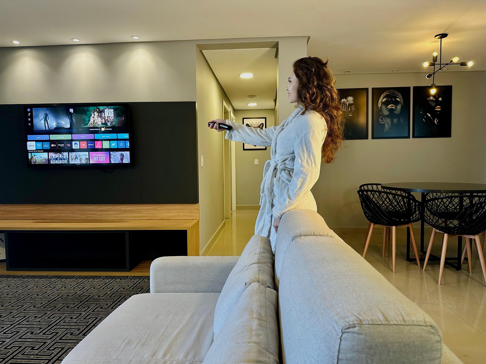 Apartamentos modernos de 120 m² para até 10 pessoas, no centro de Foz do Iguaçu. Conforto, tecnologia e recepção 24h. Cozinha completa, churrasqueira privativa, ar-condicionado em todos os ambientes e estacionamento gratuito para 2 veículos (com reserva). O condomínio oferece lazer completo: piscina, jacuzzi aquecida, sauna, academia, brinquedoteca, sala de jogos, coworking, salão de beleza e mercado 24h.