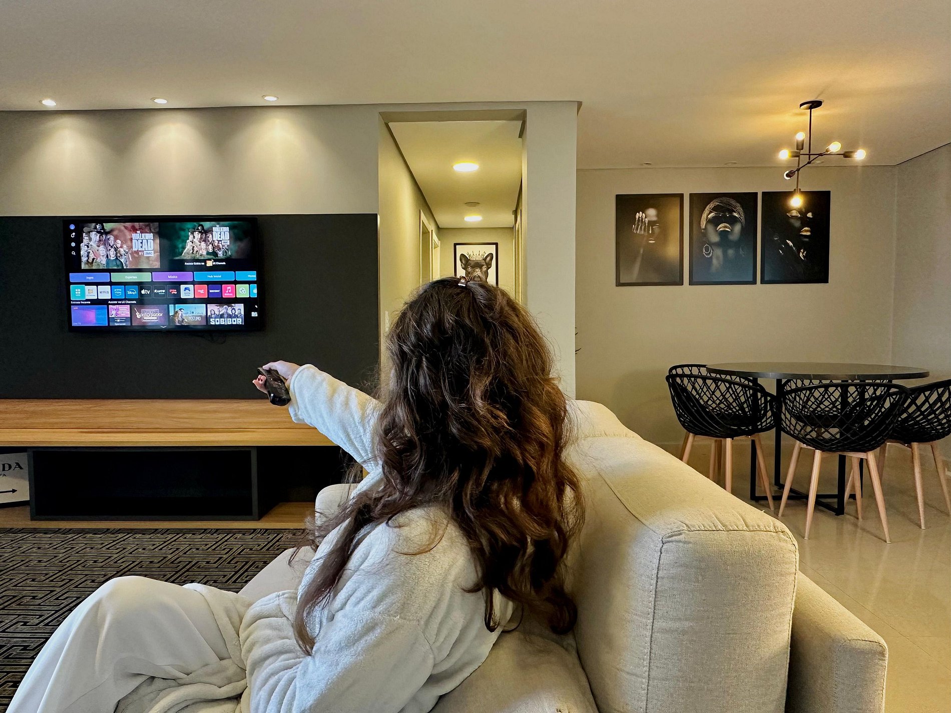 Apartamentos modernos de 120 m² para até 10 pessoas, no centro de Foz do Iguaçu. Conforto, tecnologia e recepção 24h. Cozinha completa, churrasqueira privativa, ar-condicionado em todos os ambientes e estacionamento gratuito para 2 veículos (com reserva). O condomínio oferece lazer completo: piscina, jacuzzi aquecida, sauna, academia, brinquedoteca, sala de jogos, coworking, salão de beleza e mercado 24h.